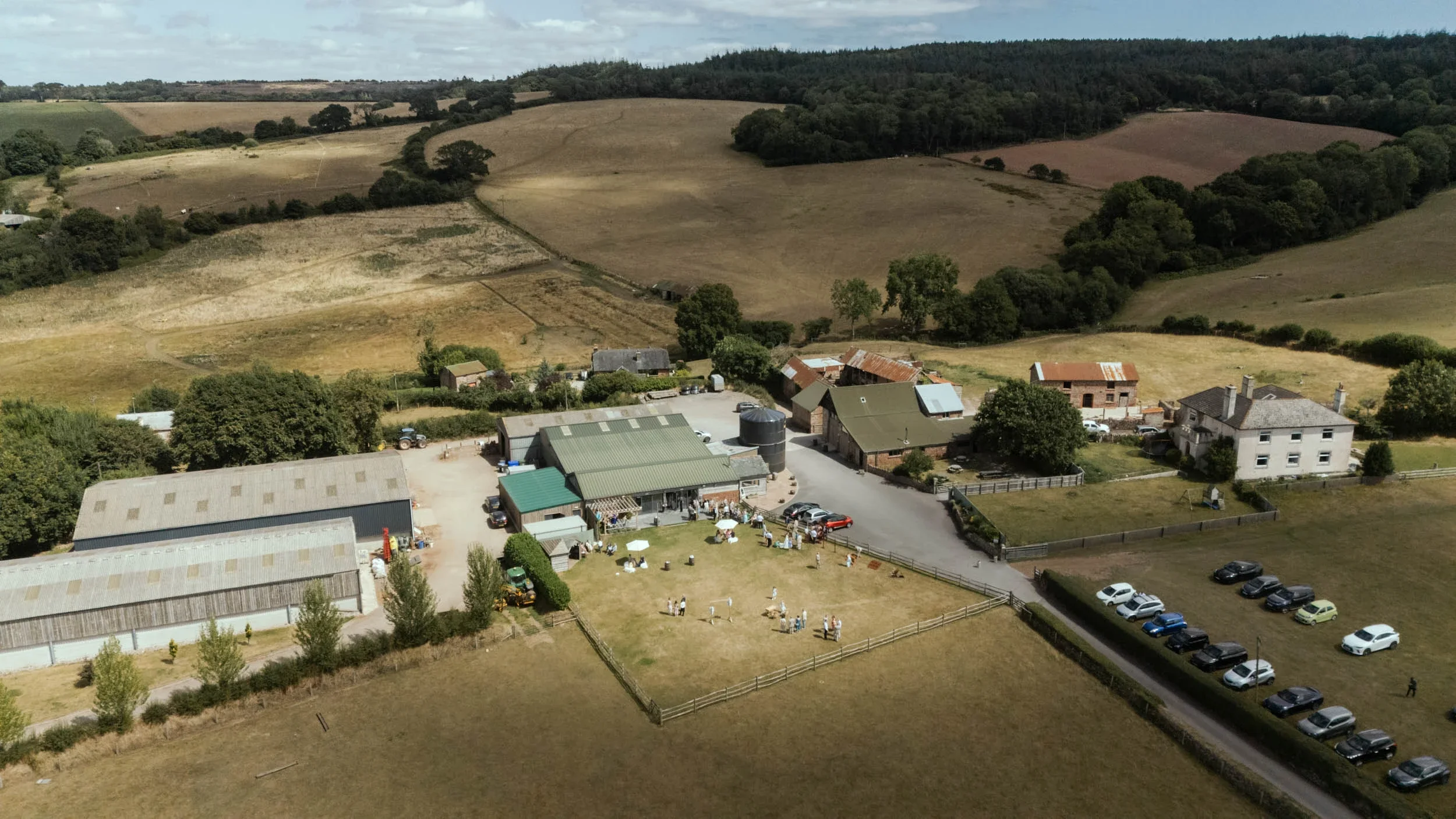 The setting is classic rural Devon: rolling countryside, Dartmoor views stretching out, glimpses toward the Teign Estuary, open sky everywhere. Capacity handles around 135 seated for the day and up to 250 in the evening, but the openness of the landscape means it never feels packed or tight.